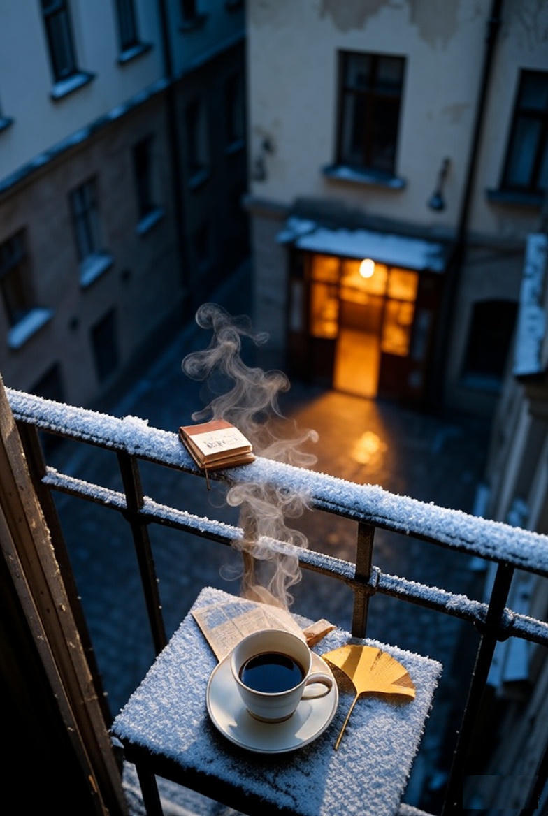 I stepped onto it, and the cold December air bit at my cheeks, biting and clean, carrying the faint smell of smoke from chimneys and distant bakeries. My fingers clutched the railing, wooden and slightly frosted, and I let my eyes wander across the city. And then, tucked between two old buildings below, I saw it, a tiny coffee shop, glowing softly in amber light. It wasn’t loud or crowded, it seemed as if the world itself had folded around it to keep it hidden. Every morning, an old man appeared there like clockwork. He ordered a cup of coffee, stepped outside, and settled at the single little table beneath the striped awning, unfolding his newspaper with quiet ritual. Steam rose from the cup, curling lazily into the cold air, and I watched, mesmerized, the rhythm of his small, perfect world.