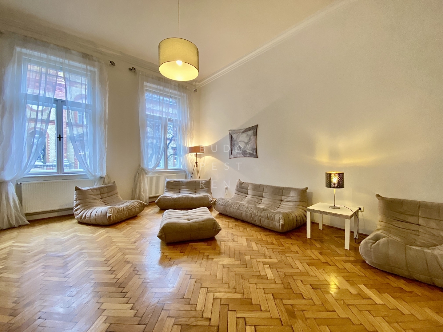 A magas belmagasság és a nagy ablakok klasszikus budapesti hangulatot teremtenek, világos, levegős érzetet biztosítva az egész lakásban.